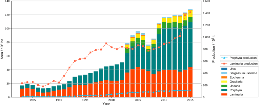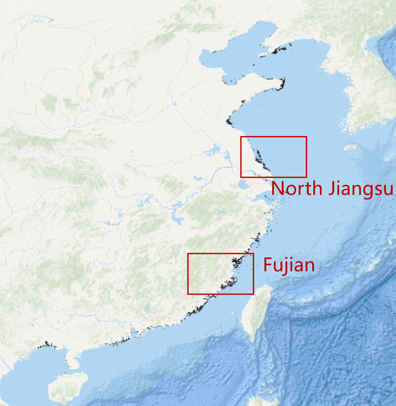 Shandong (Geographically called Subei, north Jiangsu) and Fujian province are largest seaweed and bivalve producers