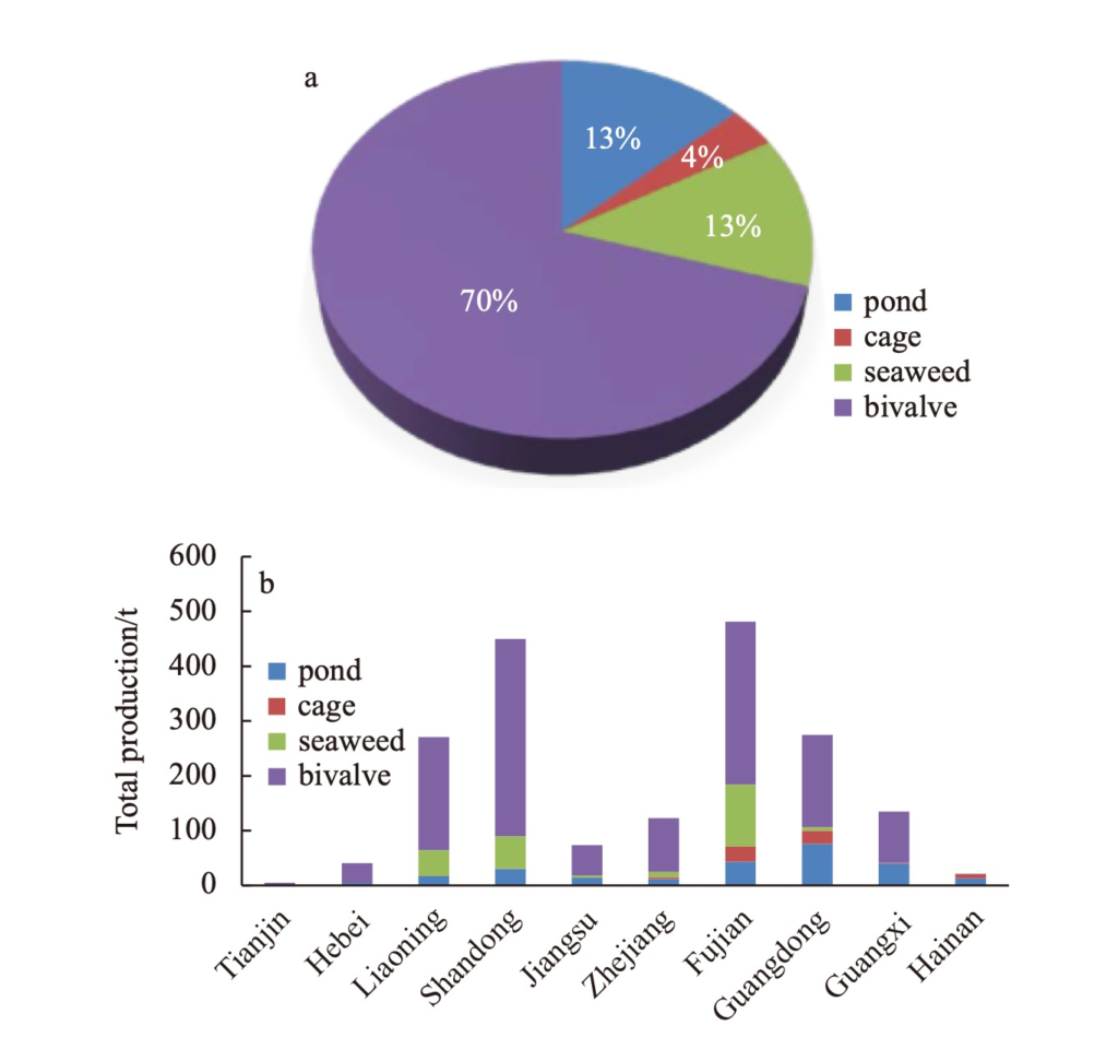 Percentage of total production in typical mariculture systems (a), and the proportion of yield in typical mariculture systems in coastal provinces of China in 2019 (b) (Zhang et.al. 2022)